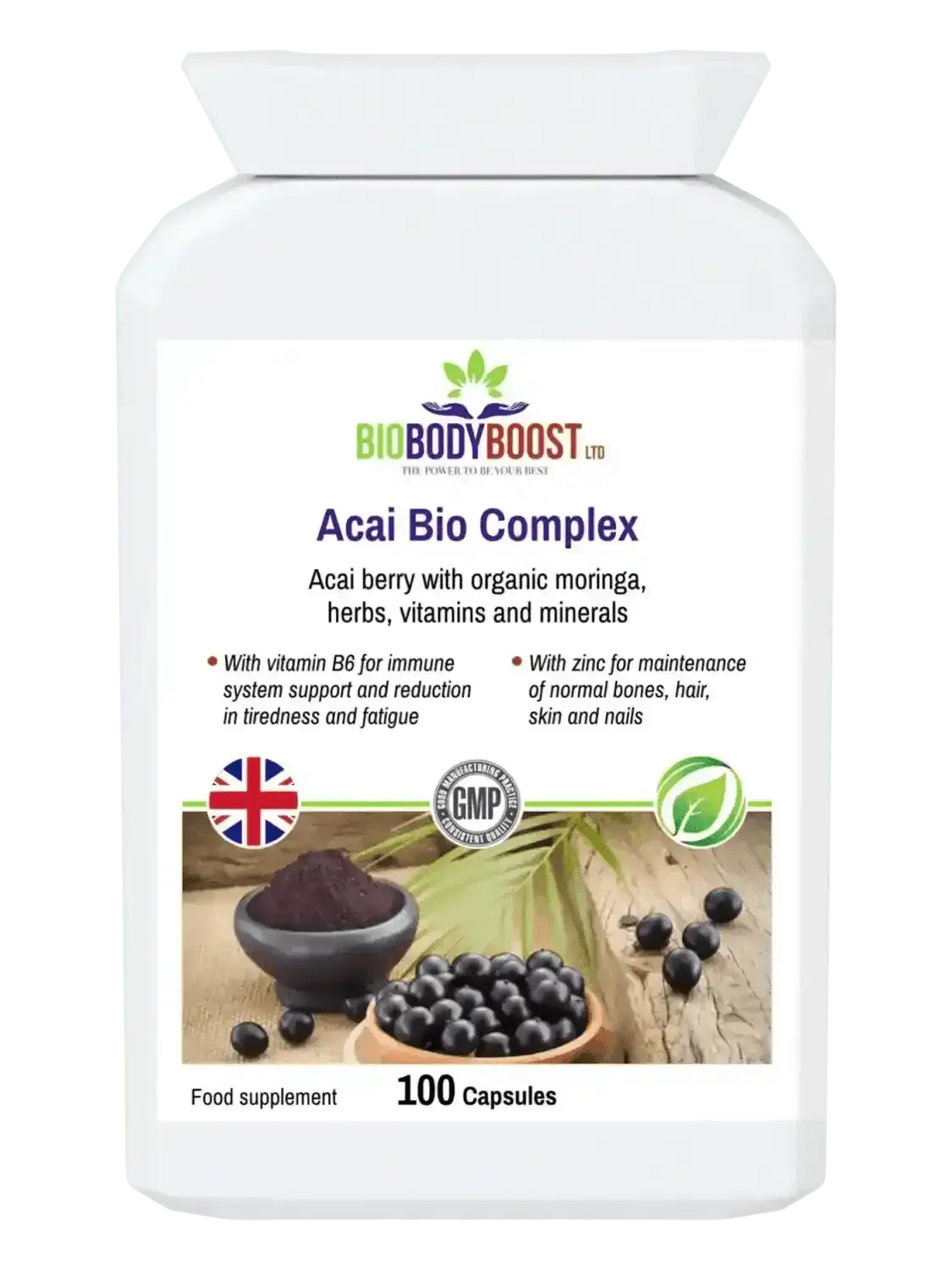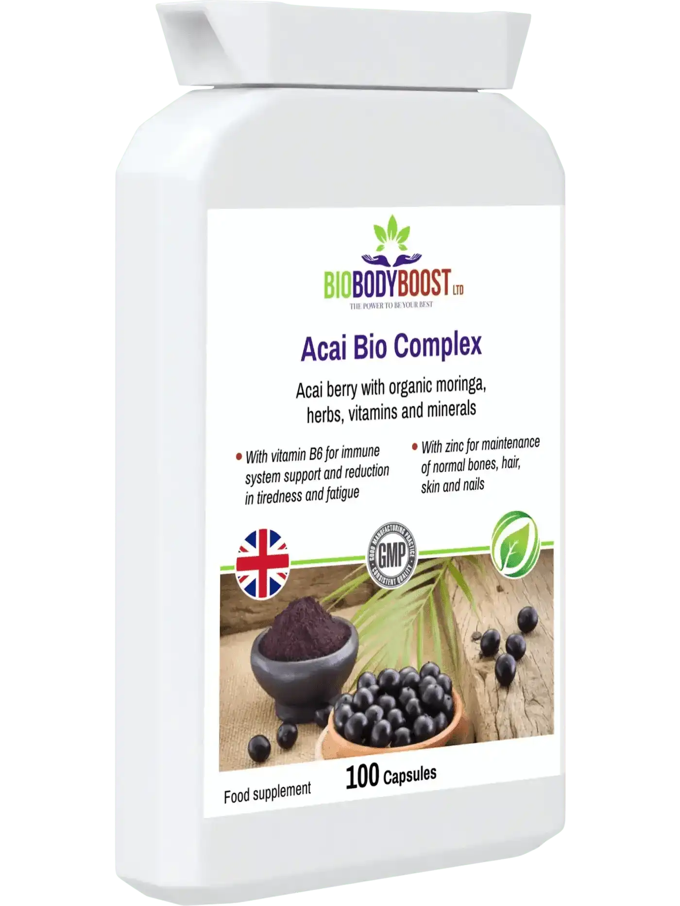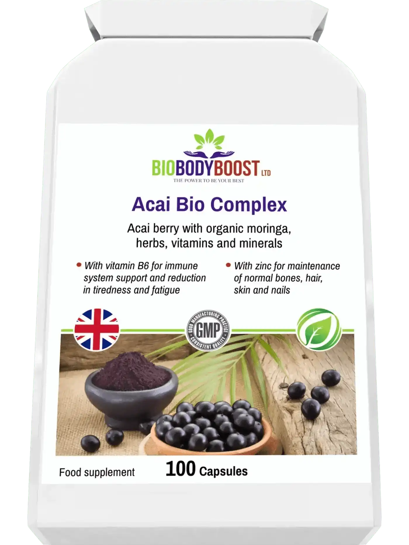 Entdecken Sie die Kraft des Acai Bio Complex , eines hochwertigen Nahrungsergänzungsmittels mit Acai-Beeren, das Ihr Immunsystem unterstützt, Ihre Energie steigert und Ihr allgemeines Wohlbefinden fördert. Vollgepackt mit natürlichen Antioxidantien, Vitaminen und pflanzlichen Nährstoffen ist diese Formel Ihre tägliche Dosis Vitalität.