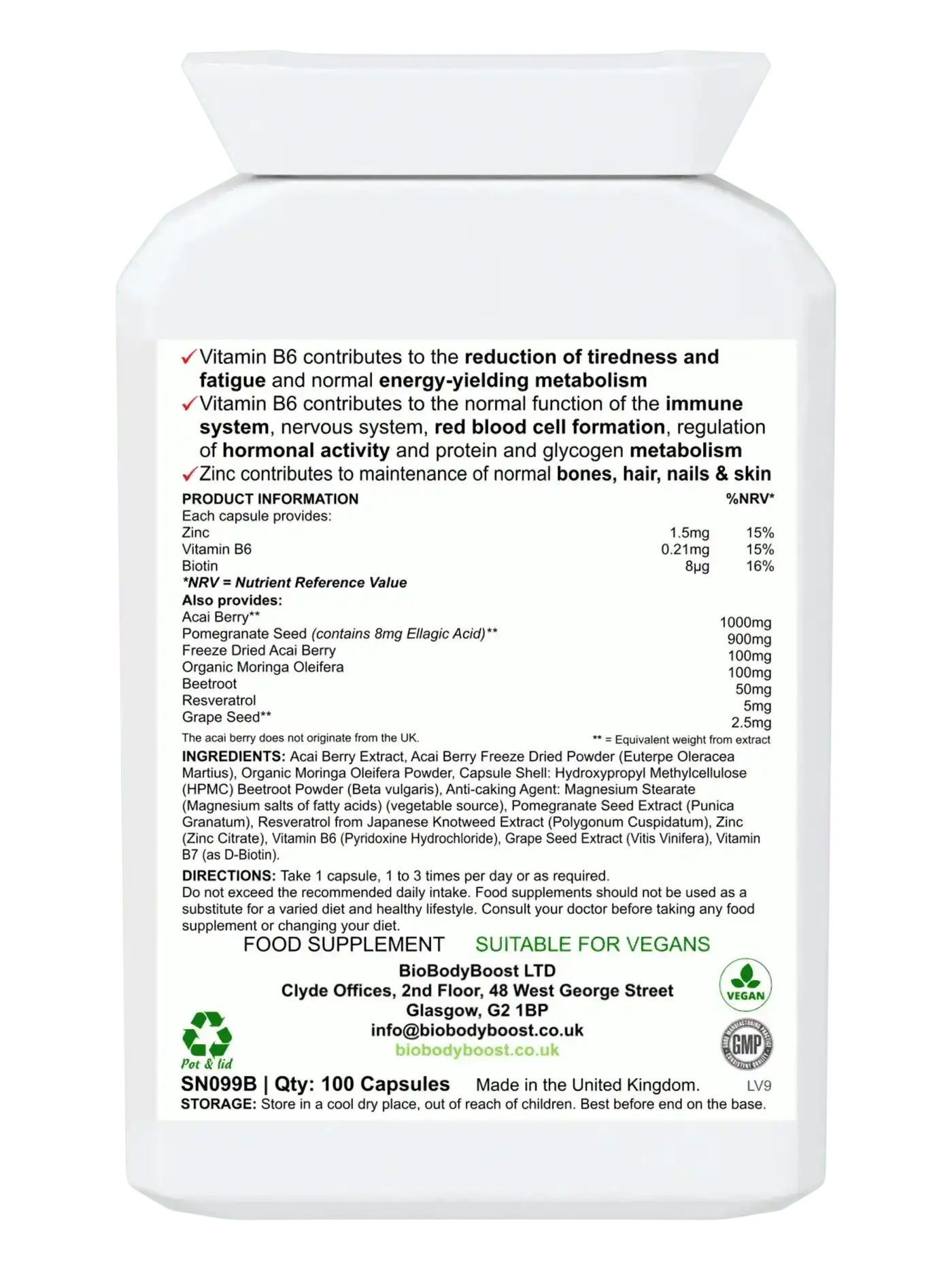Acai-Beeren-Extrakt, gefriergetrocknetes Acai-Beeren-Pulver, Bio-Moringa-Oleifera-Pulver, Hydroxypropylmethylcellulose (HPMC), Rote-Bete-Pulver, Magnesiumstearat (pflanzliche Quelle), Granatapfel-Extrakt, Resveratrol-Pulver, Zinkcitrat, Vitamin B6 (Pyridoxin HCL), Traubenkernextrakt, Biotin (D-Biotin).