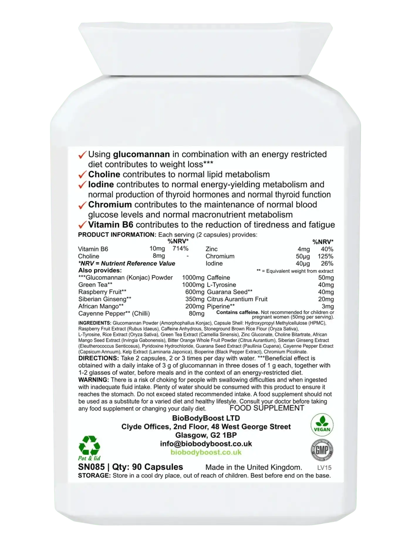 Dieses thermogene Nahrungsergänzungsmittel wurde mit einer speziellen Kombination synergistischer Kräuter und Nährstoffe entwickelt. Jede Kapsel enthält 11 pflanzliche Inhaltsstoffe (Glucomannan (Konjak)-Pulver, Grüntee, Sibirischer Ginseng, Afrikanische Mango, Zitrus-Bioflavonoide, Paprika, Himbeeren, Koffein, L-Tyrosin, Guarana und Piperin (Schwarzer-Pfeffer-Extrakt)) sowie Vitamin B6, Cholin, Zink, Chrompicolinat und Jod.