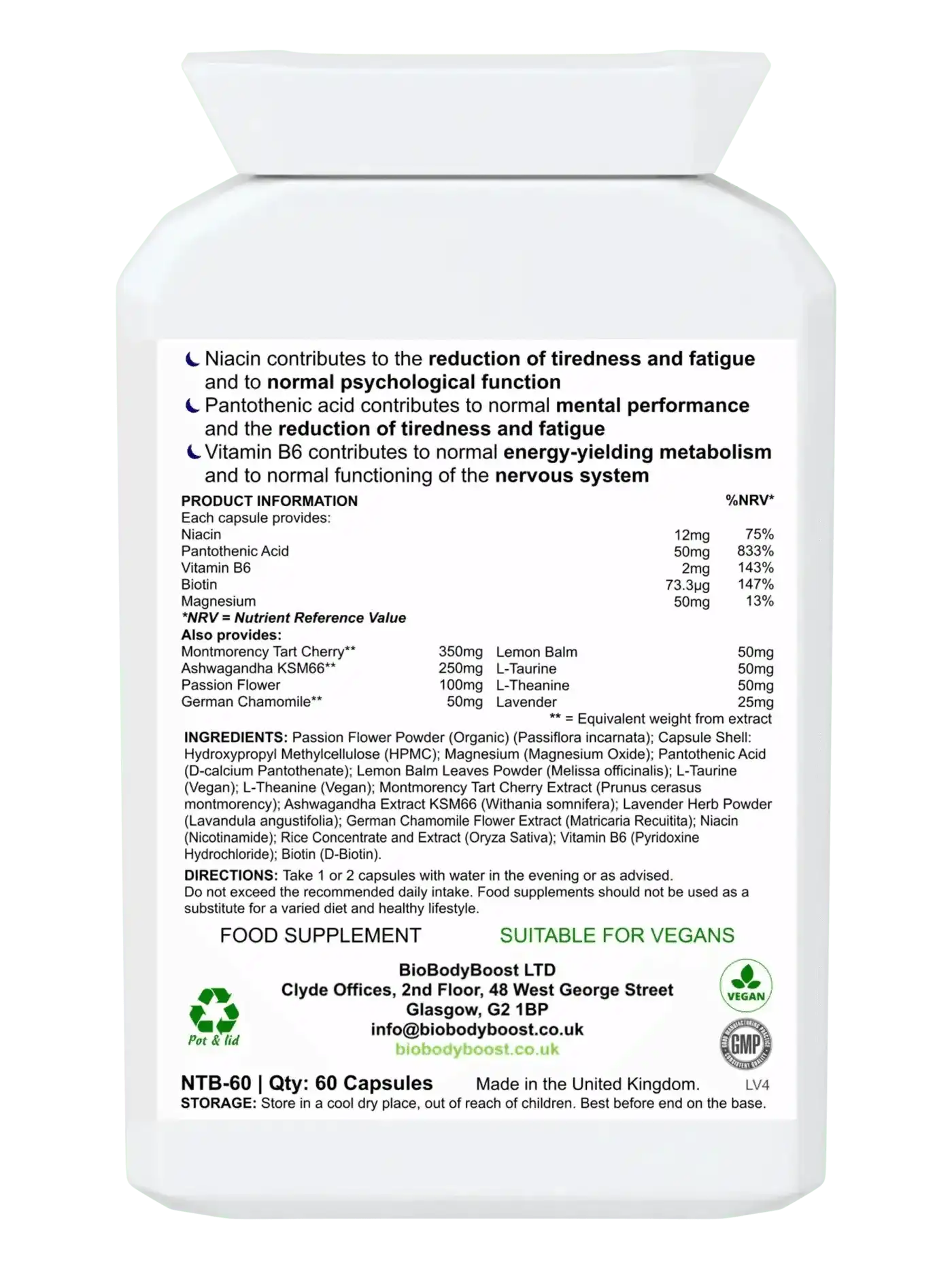 Zutaten: Passionsblumenpulver (Bio) (Passiflora incarnata); Kapsel: Hydroxypropylmethylcellulose (HPMC); Magnesiumoxid; D-Calciumpantothenat; Zitronenmelissenblätter (Melissa officinalis); L-Taurin (vegan); L-Theanin; Ashwagandha-Extrakt (Withania somnifera); Lavendelkraut (Lavandula angustifolia); Echter Kamillenblütenextrakt (Matricaria Recuitita); Nicotinamid (Vitamin B3); Trennmittel: Natürliches Reiskonzentrat (NuFlow); Trennmittel: Natürlicher Reisextrakt (NuMag); Pyridoxinhydrochlorid; Biotin.