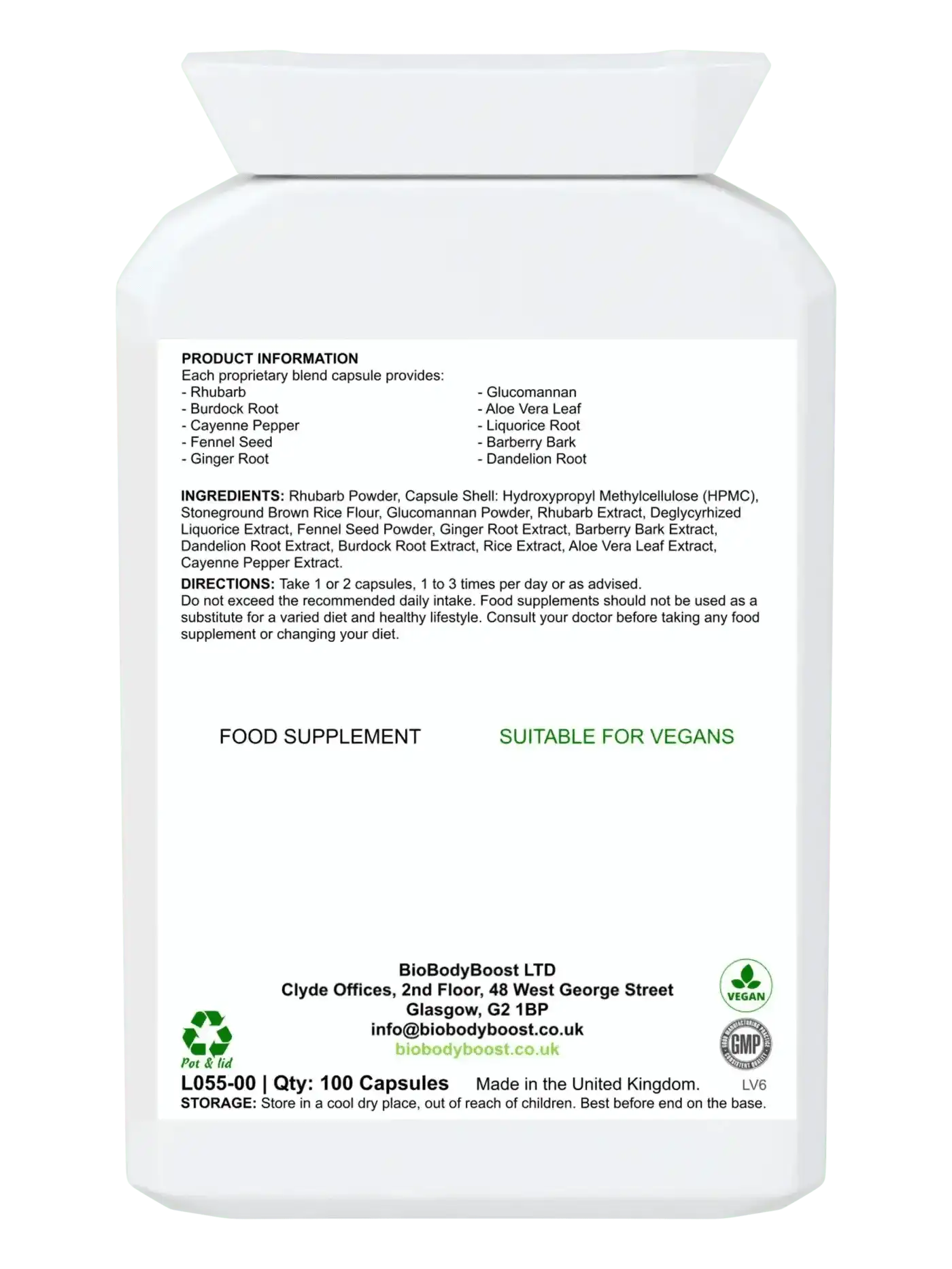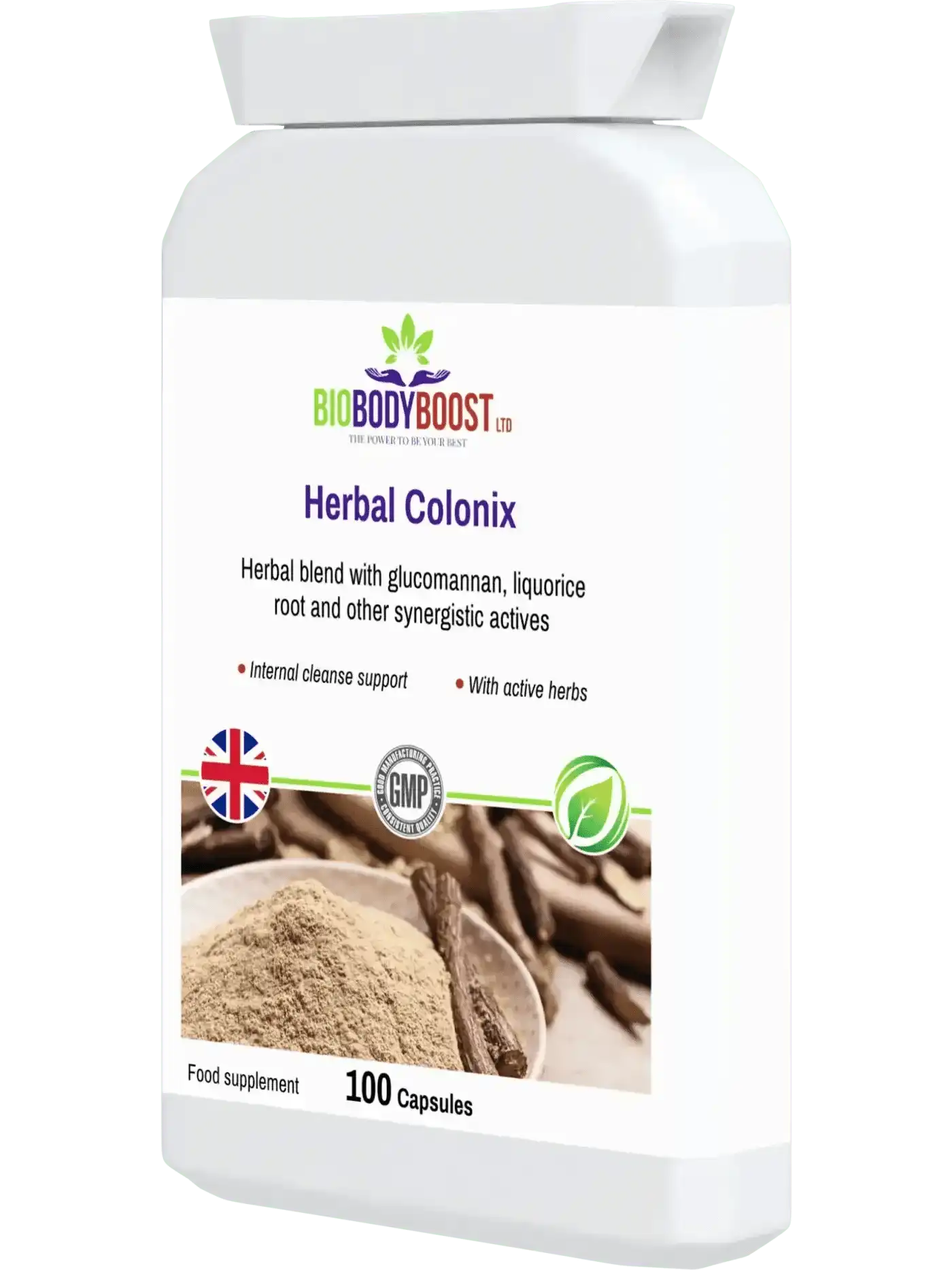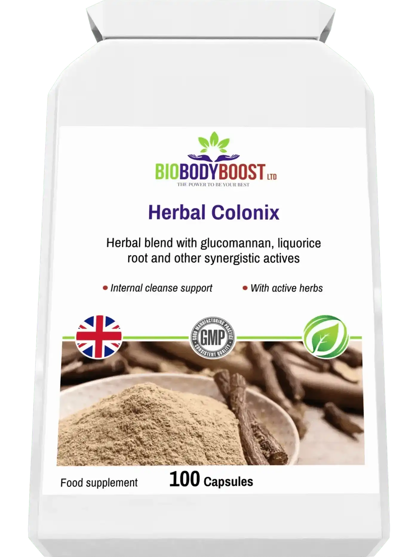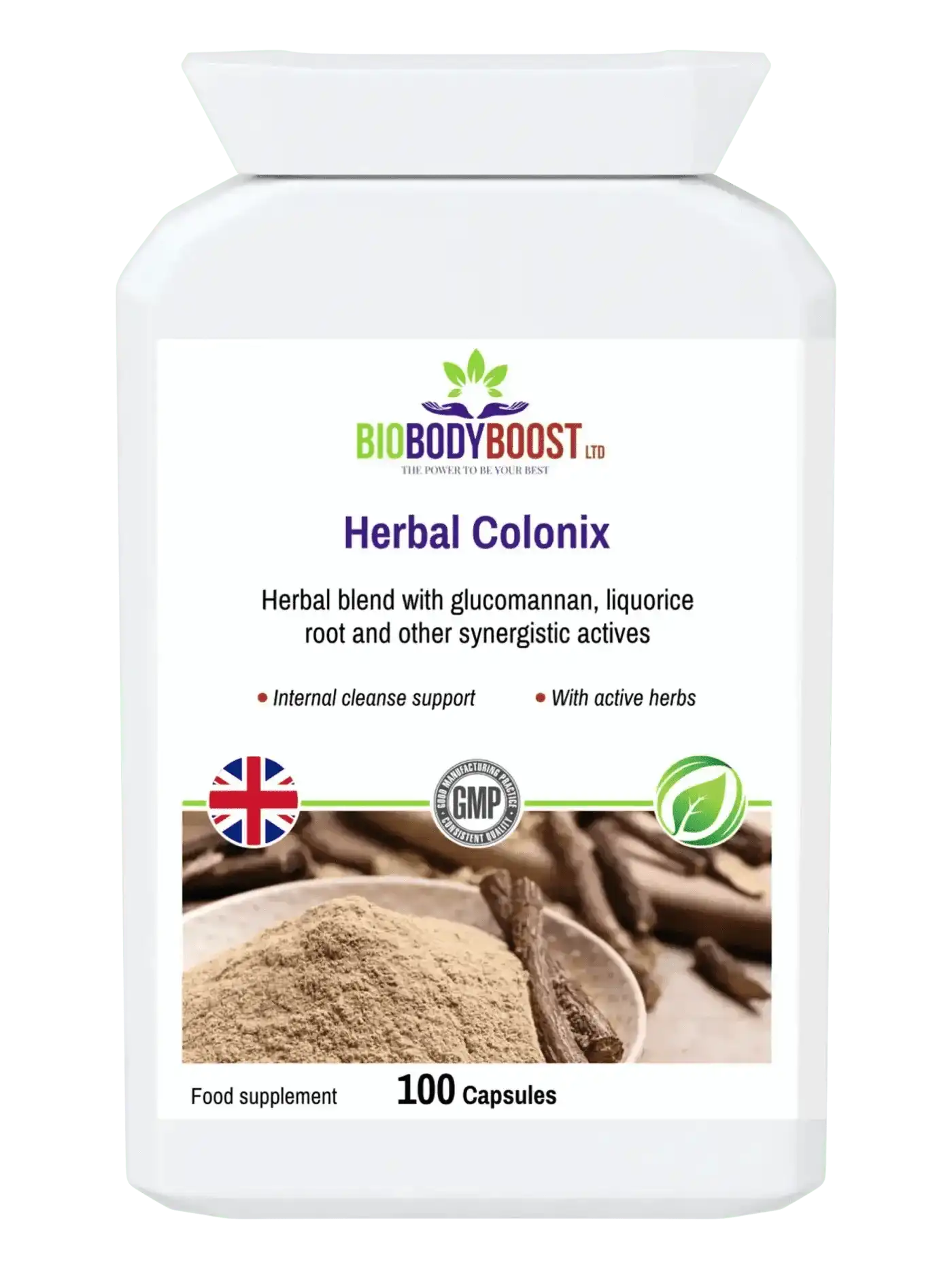 Eine Kombination aus aktiven Kräuterzutaten zur Unterstützung der Dickdarmgesundheit : Rhabarber, Klettenwurzel, Cayennepfeffer, Fenchelsamen, Ingwerwurzel, Glucomannan, Aloe Vera, Süßholzwurzel, Berberitze und Löwenzahnwurzel.