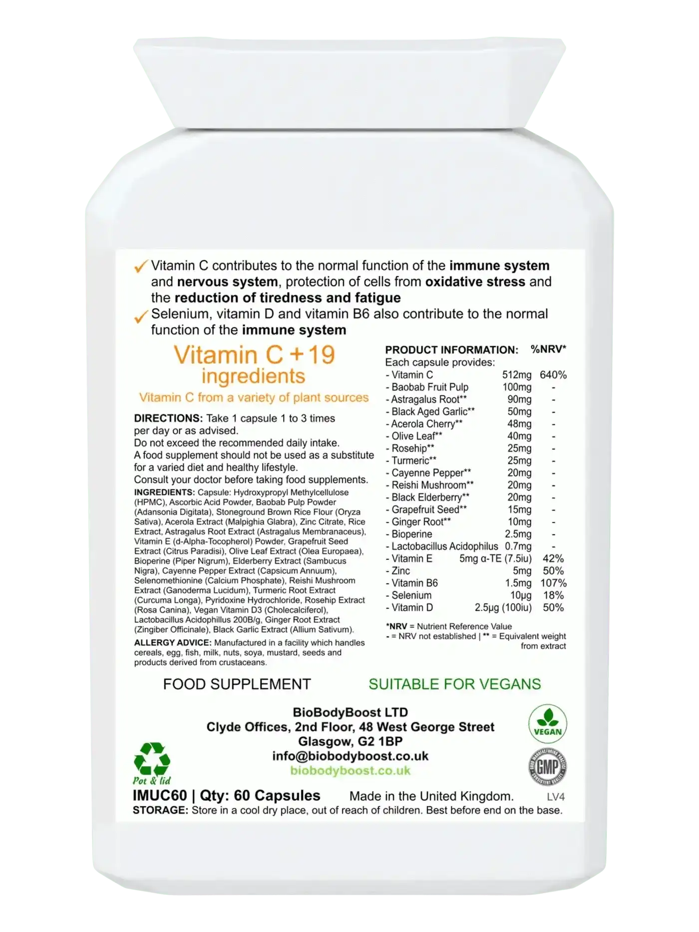 Zutaten: Kapsel: Hydroxypropylmethylcellulose (HPMC), Vitamin C (als L-Ascorbinsäure), Baobab-Fruchtfleisch, Acerola-Kirsch-Extrakt, Trennmittel: Magnesiumstearat (pflanzliche Quelle), Zink (als Zinkcitrat), Vitamin E (als DL-Alpha-Tocopherylacetat), Lactobacillus Acidophilus, Füllstoff: Braunes Reismehl, Reishi-Pilz-Extrakt, Grapefruitkern-Extrakt, Olivenblatt-Extrakt, Schwarzer Pfeffer-Extrakt (Piper Nigrum), Schwarzer Holunderbeer-Extrakt, Cayenne-Pulver (Capsicum Frutescens)-Extrakt, Selen
