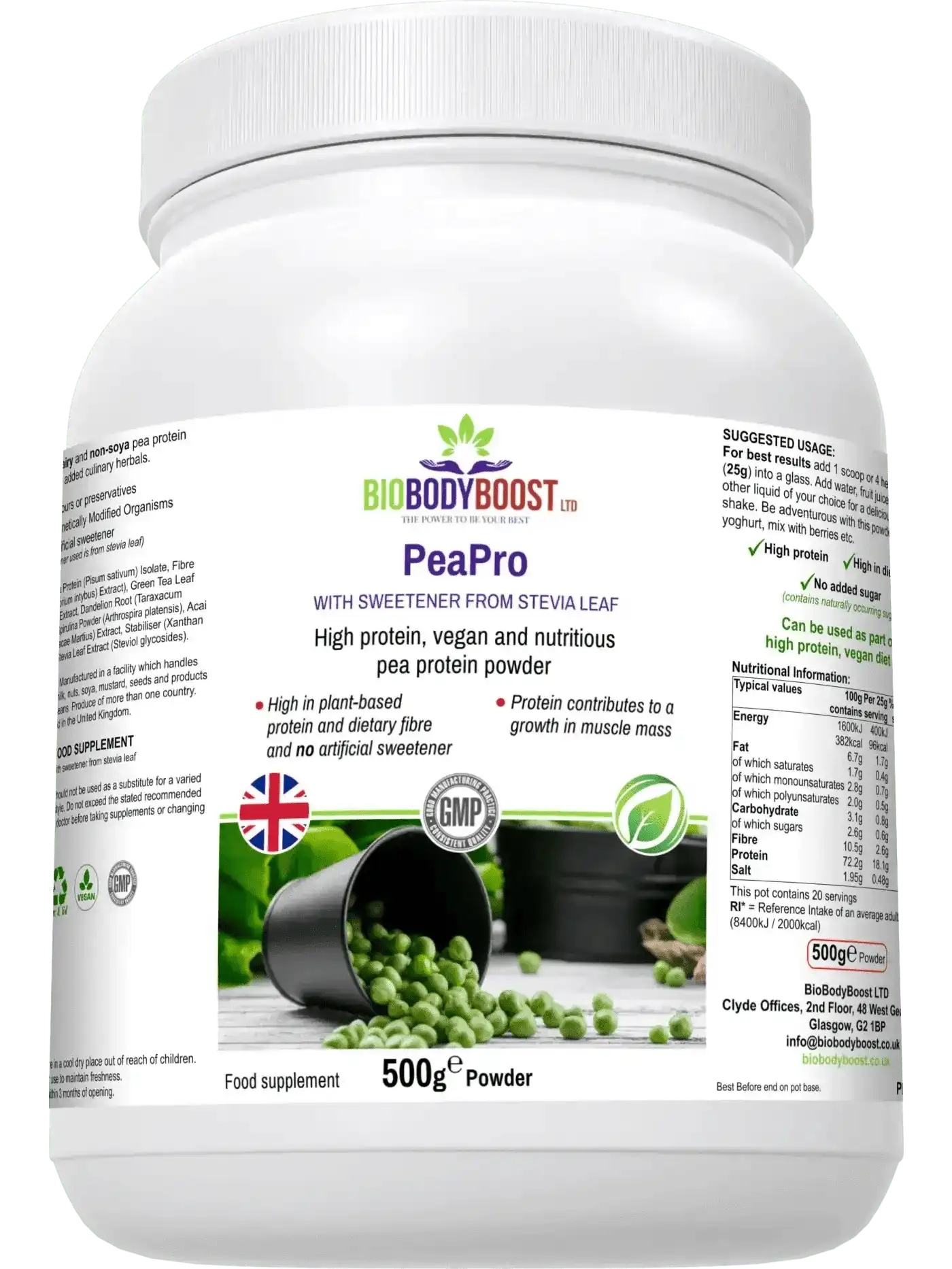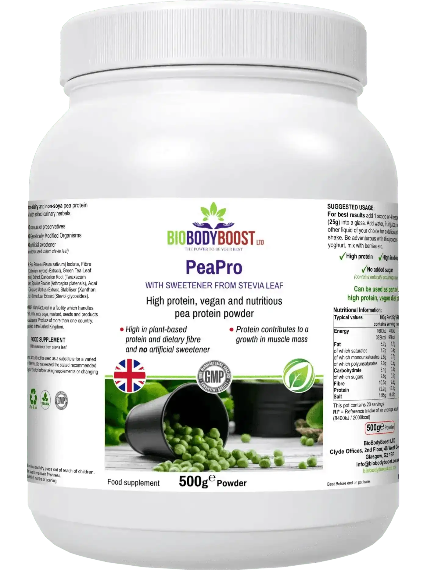 - Hoher Proteingehalt: PeaPro-Pulver ist vollgepackt mit pflanzlichen Proteinen, die für Muskelwachstum und -reparatur unerlässlich sind.