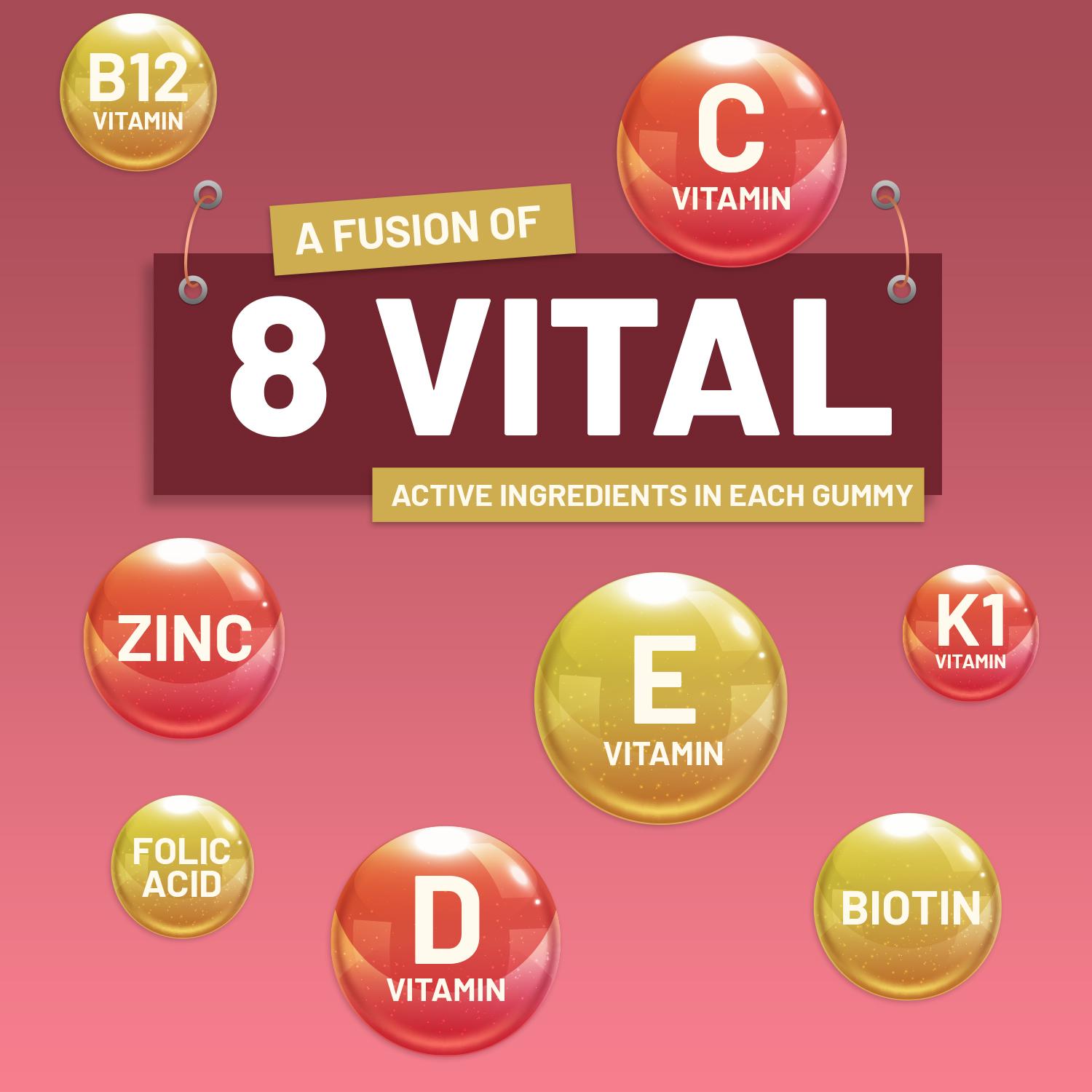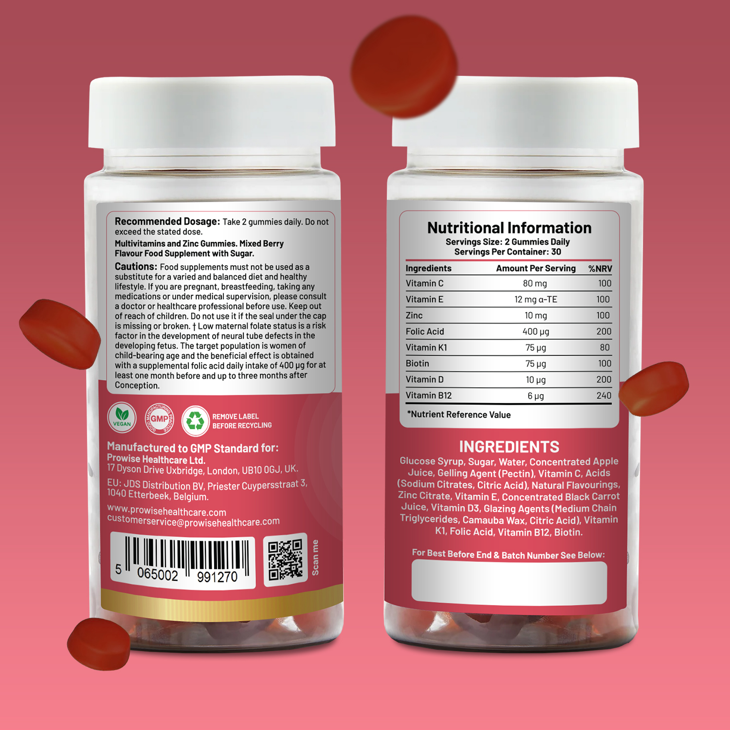 Glukosesirup, Zucker, Wasser, konzentrierter Apfelsaft, Geliermittel (Pektin), Vitamin C, Säuren (Natriumcitrate, Zitronensäure), natürliche Aromen, Zinkcitrat, Vitamin E, konzentrierter schwarzer Karottensaft, Vitamin D3, Überzugsmittel (mittelkettige Triglyceride, Camaubawachs, Zitronensäure), Vitamin K1, Folsäure, Vitamin B12, Biotin.